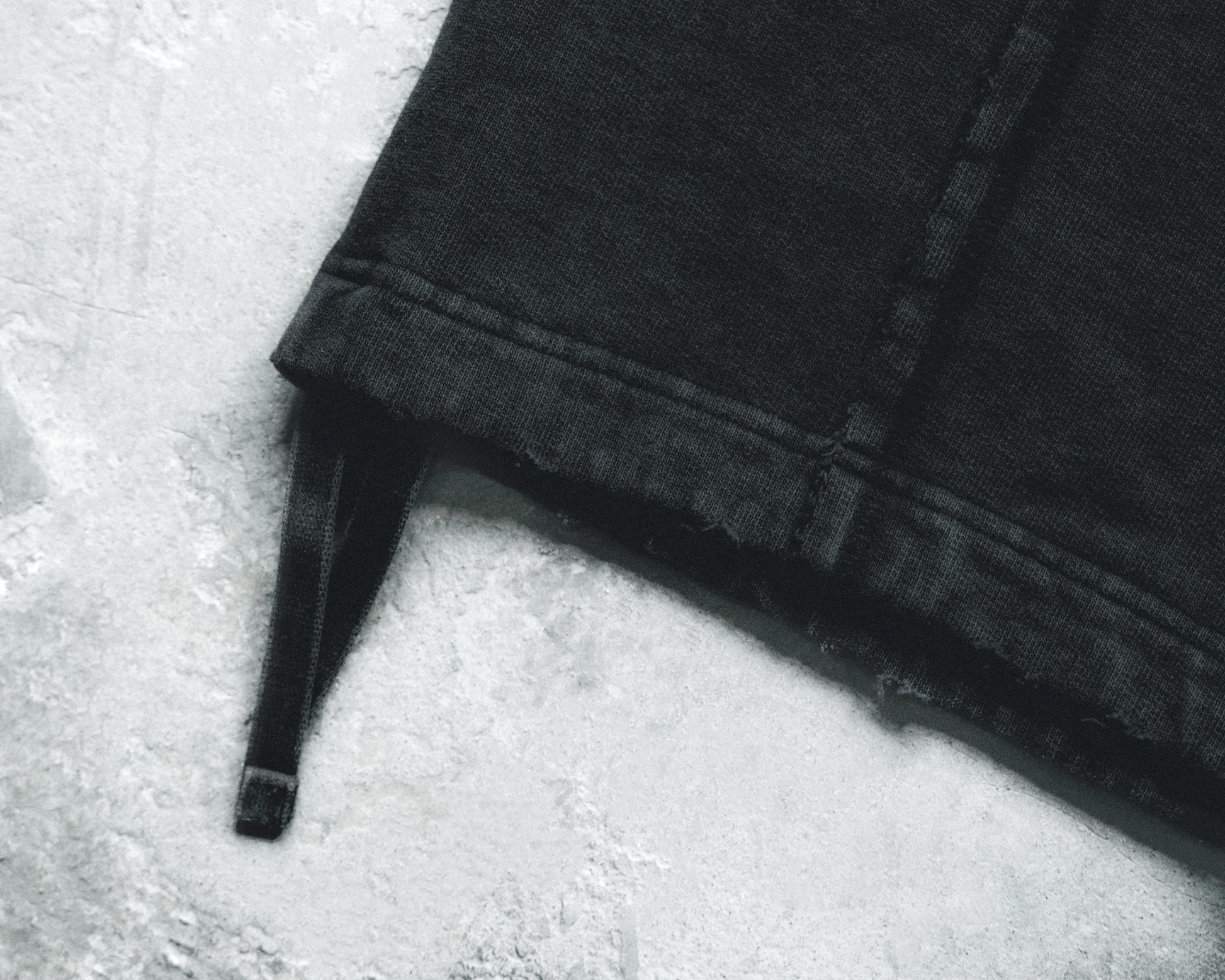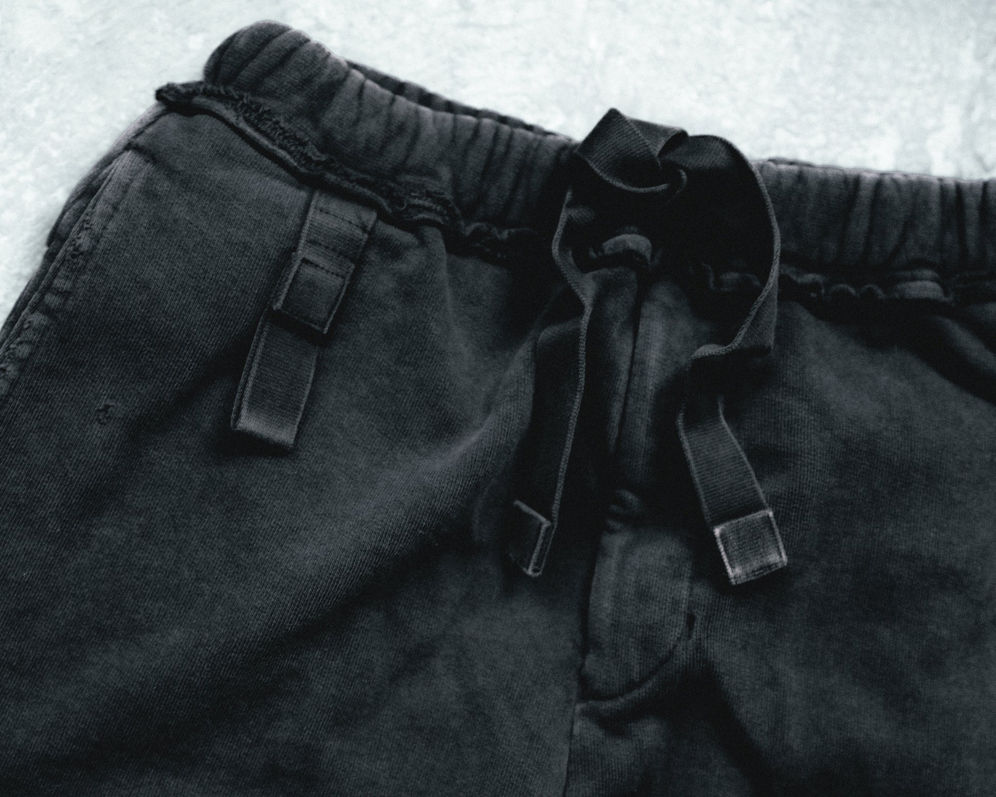 しっかりとした度詰めのコットン100%裏毛を使用したスウェットパンツ。晒の生地を硫化染めでブラックに仕上げ、柔軟洗いで着心地のよさを追求。ストーンウォッシュ加工と、入れすぎないダメージ加工で風合いのあるパンツに仕上げている。